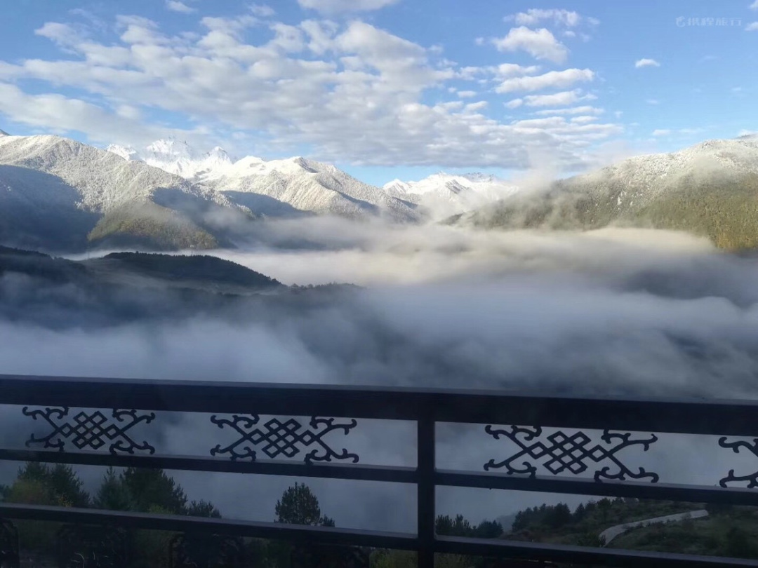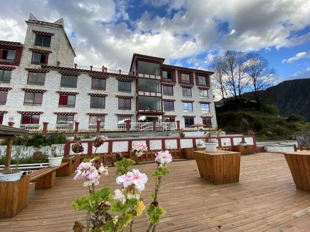 酒店位于原始森林的边缘,被雪山、草地和美丽的喇嘛庙围绕着,
