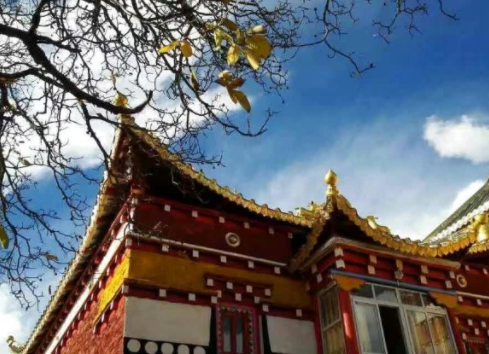 白色的藏房和金顶的寺庙在透蓝的天空下隐约可见,