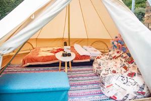 露营的帐篷属于奢侈型帐篷,空间大并且舒适,有两人帐篷和四人帐篷!帐篷的布置十分温馨,让你有家的感觉!
