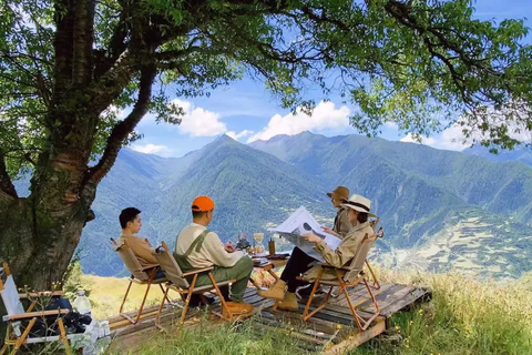 早上7:30准时在(黄忠路1号上品优空间门口)出发,正常情况下4个小时左右可以到达木尔寨,途中经过巴郎山,在巴朗山(贝母坪)上看了云海之后在出发前往达木尔寨午餐,午餐后稍作休息出发前往营地,约20分钟左右,到达营地后大家可以在营地拍照或者徒步到营地后山上采摘野生菌,在营地大家煮一壶茶或咖啡,夏季遥看峡谷云雾缭绕冬季雪山绚烂多姿,在营地晒着和煦的阳光,望着远山静静的发呆,放空自己。晚上可以徒步5分钟看峡谷万家灯火。