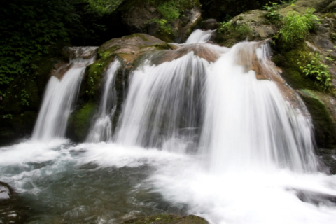 在这片天然氧吧中,深吸一口气,在尘都久经考验的肺也舒服了不少。由两溪口沿竹溪登獐子崖,进入“瀑布群景区”,溪流源头的十支瀑布在这里形成大小重叠的漂瀑流泉。