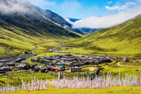 莫斯卡村海拔 3900米 ,被三座神山环抱,集雪山、森林、草原、冰河、海子为一体。