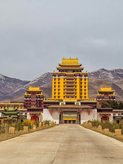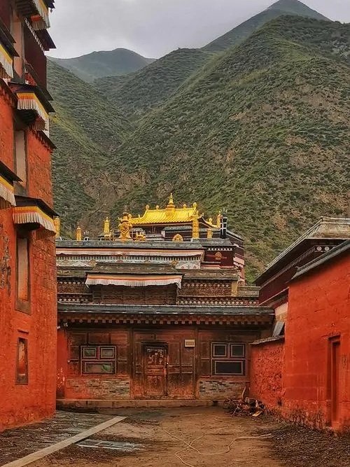 各莫寺坐落在草地上,远处雪山若隐若现。法喜苑高大的墙上,红、黄、蓝、白、棕五色交映,鎏金屋顶发出圣洁的光芒。视觉冲击力非常强,让人久久不忘。