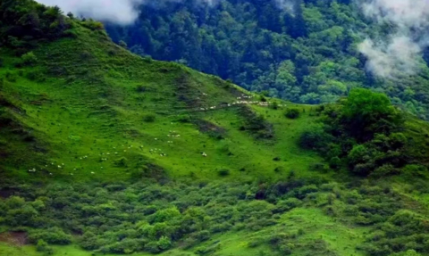 登顶云中岭,视野超级开阔,牧场在群山环绕中十分的浪漫,四周都被蓝天、白云、雪山、森林保卫,远眺是美丽的群山峻岭和雪山,向下看是牛羊成群,仿佛置身于一幅壮丽的画卷之中。