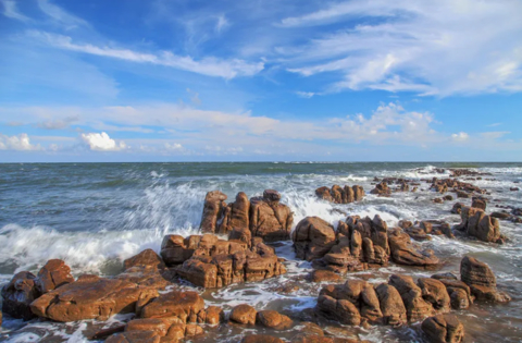 早餐可选择一碗鲜美的海鲜粥然后集合跟着京族三岛渔民乘船一起出海体验捕鱼的乐趣,观赏京族三岛渔民特有的作业场景,深入了解渔民出海捕鱼的生活方式,中午回到金滩午餐吃海鲜,或者早起赏海上日出,遥望越南,之后享受美味早餐海鲜粥,随后从住处前往到保存较为原始的中国唯一的倾覆性火山遗迹——怪石滩游玩;怪石滩是粤西著名的火山地质风景区,整个海湾就是当年的火山口!一边是原始森林,一边是湛蓝的大海!加上形状千奇百怪的褚红色的火山岩,远看像是古城墙,走近看却是层层叠叠的高温熔岩,与邻近的大海相映衬,景色令人拍岸叫绝!