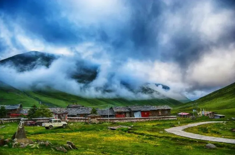 莫斯卡村海拔 3900米 ,被三座神山环抱,集雪山、森林、草原、冰河、海子为一体。