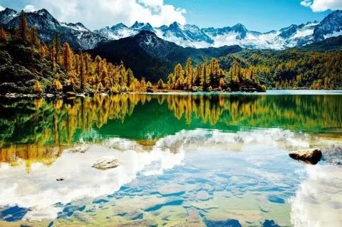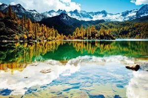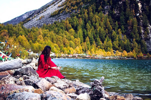 葫芦海,第四纪冰川退缩后形成的高原堰塞湖,形如葫芦如提琴如宝镜,湖泊清透平静,美妙倒影奇光异色,海子的侧畔,一株株红杉挺拨而遒劲,茂密而干练的针叶由绿变红。