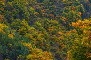 奶子沟彩林洋洋洒洒长达八十里,蔚为壮观。树种主要由桦树、松树、柏树、枫树和各种乔木组成,还有不同色彩的针叶林、阔叶林、次生林、灌木丛点缀其间,密密麻麻地覆盖了一坡又一坡。