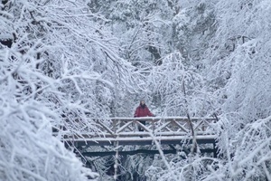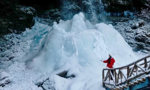 一步一脚印,近距离感受雪花和大自然的冬日温柔。一走到进去深处,便可近距离体验大自然的创造力。十层楼高的瀑布,从石桥中间倾泻而出,此刻只听“哇”声一片。