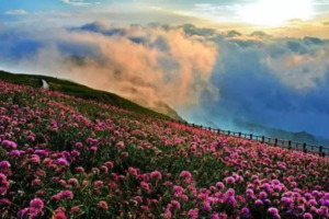 每年暮春时节,百里杜鹃花开成海。这个时候置身崇山峻岭之中。看腾挪跌宕、绵延百里的杜鹃花海,宛如人间仙境。