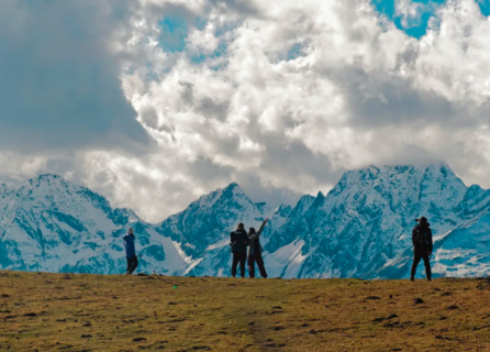 半原始森林山脊纵走,远处雪山不时隐现,感受回归山野的真趣。穿过最后一段树林,迎面一片宽阔的草场,雪山浮现视野。