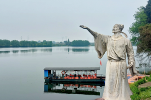 “舟行碧波上,人在画中游”,岸边柳眉桃腮,燕语呢喃。