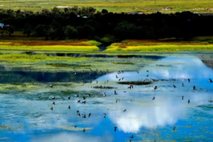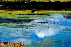 花湖很美,美中三绝——珍禽、闪电和彩虹。传说中的花湖最美在五六月份,晴天时蓝天、白云、碧草、野花、珍禽相映成趣;雷雨交加时,闪电金光闪烁,横行天空,在天为利刃,掷地为火球。而在阴云密雨覆盖之外则会映现出瑰丽的彩虹,在辽阔的草原,美丽的花湖,出现“东边日出西边雨”的意境不是传奇。天上的彩虹映入水里,更是美不胜收。