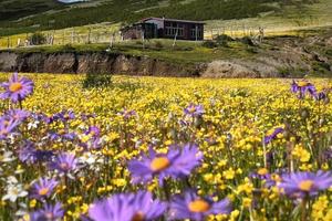 湛蓝的天空、高耸的雪峰、辽阔的草原、浩瀚的花海相互辉映,融为一体..