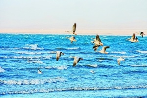 早餐后出发进入无人区,首先打卡网红公路,有着“中国版66号公路”之称的G315【波浪公路】段,在保证安全的情况大巴车可以靠边,我们在笔直的荒漠公路上拍上一组公路旅行大片,湛蓝的天空下,一望无际的戈壁滩,释放一把、跳跃一次。抵达水上雅丹前会先来到【东台吉乃尔湖】,这是一个没有被任何开发过的原生态盐湖,湖面如同“蒂芙尼蓝”一般的色调,盐地如同奶油冰激凌化开,号称“西北的马尔代夫”。