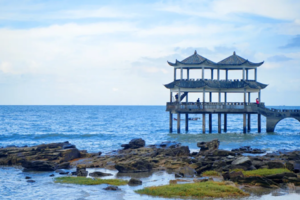 随后从住处前往到保存较为原始的中国唯一的倾覆性火山遗迹——怪石滩游玩;怪石滩是粤西著名的火山地质风景区,整个海湾就是当年的火山口!一边是原始森林,一边是湛蓝的大海!加上形状千奇百怪的褚红色的火山岩,远看像是古城墙,走近看却是层层叠叠的高温熔岩,与邻近的大海相映衬,景色令人拍岸叫绝!之后到达金滩安排住宿(万尾岛),天气好在金滩守候一场浪漫日落,晚上海边烧烤宵夜。