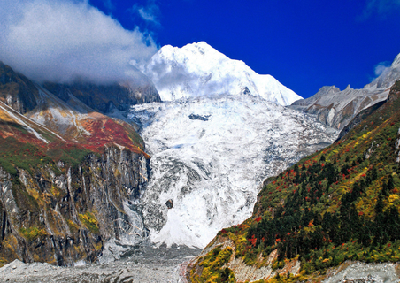 晶莹的现代冰川从高峻的山谷铺泻而下,将寂静的山谷装点成玉洁冰清的琼楼玉宇;巨大的冰洞、险峻的冰桥,使人如入神话中的水晶宫。特别是举世无双的大冰瀑布,高达1000多米,宽约1100米,比著名的黄果树瀑布大出十余倍,瑰丽非凡。