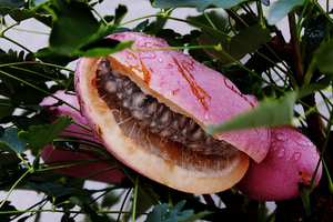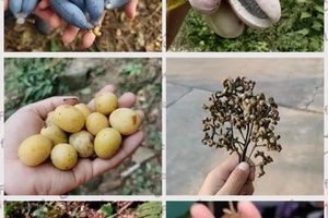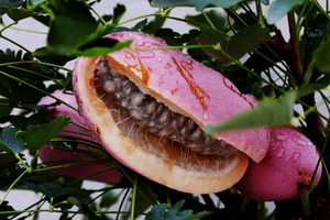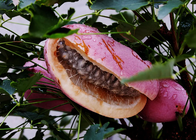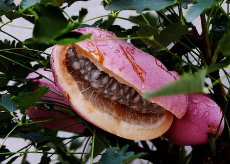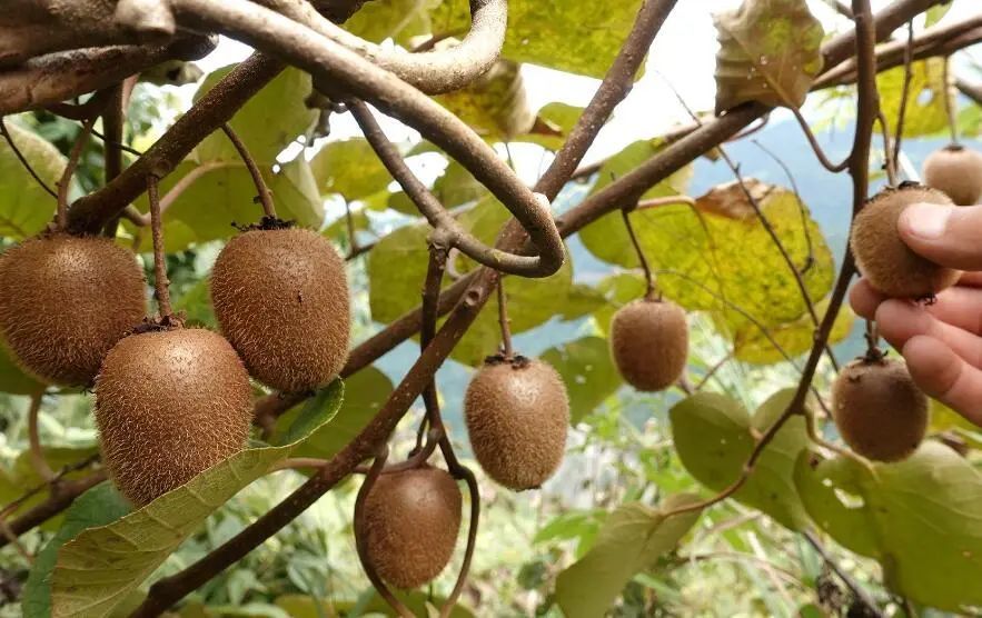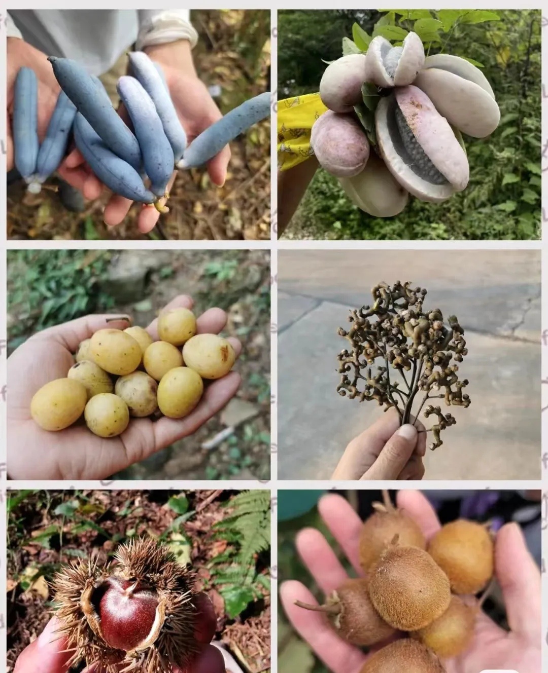 其果实为长椭圆形,有点类似于香蕉,表皮紫色或者褐色,长度约10cm左右,直径在5-6cm,成熟期主要集中在9-10月份,果肉多为白色,也有部分金黄色品种;果肉乳白多汁、香甜滑嫩、清润芬芳、美味可口,胜过蜂蜜,并且多为无污染的绿色果品,所以与猕猴桃并成为野生水果大王。