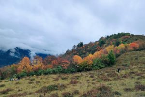 因为这里的山峰和草甸长期被云海和云朵包围,所以被山峰被称为云中岭,高山草甸被称为云中牧场!美丽的云朵,美丽的云海,加上彩林和金黄色的草甸,美轮美奂。