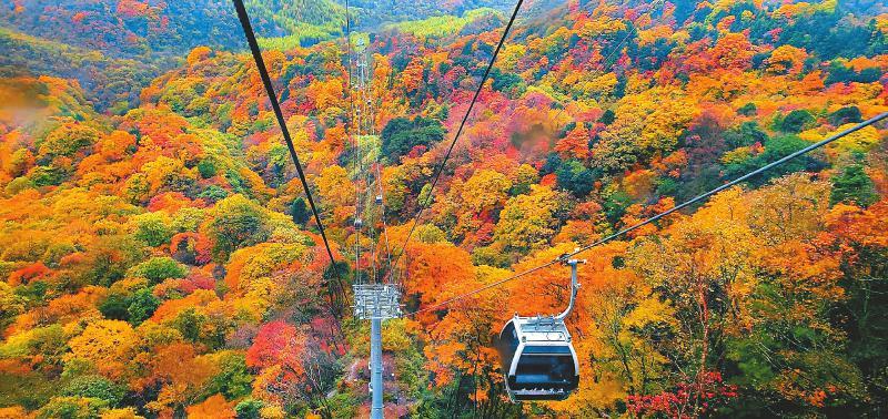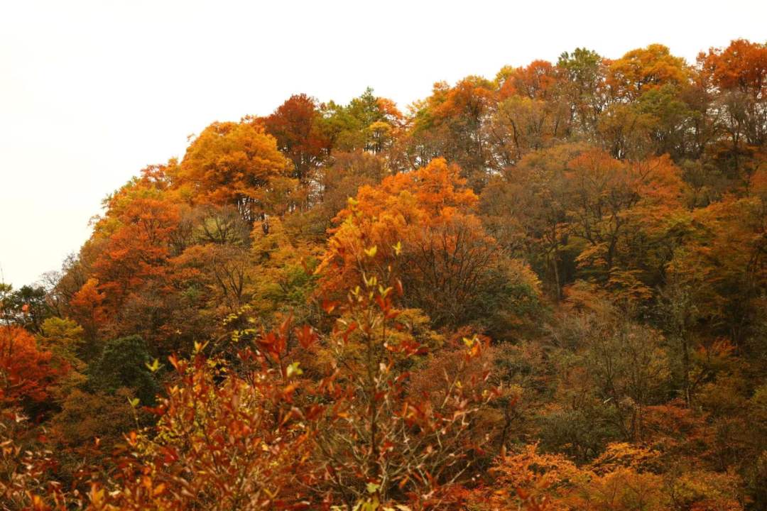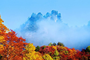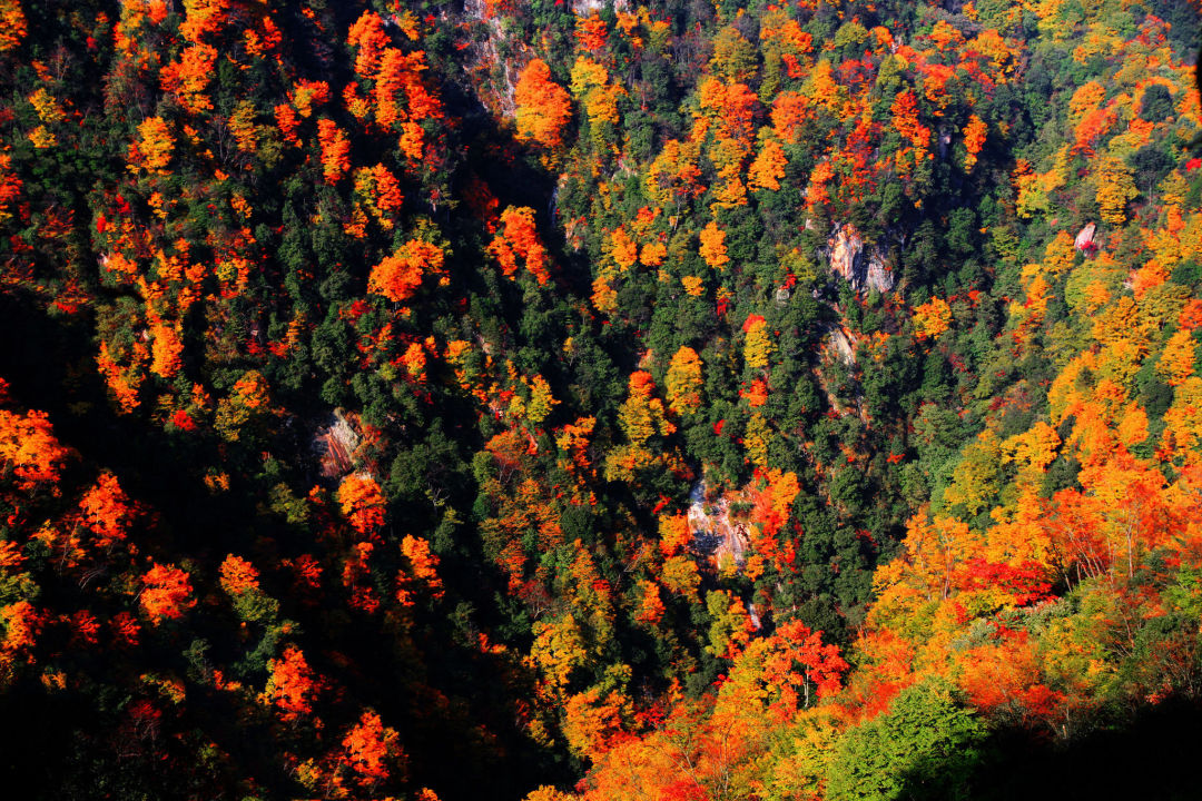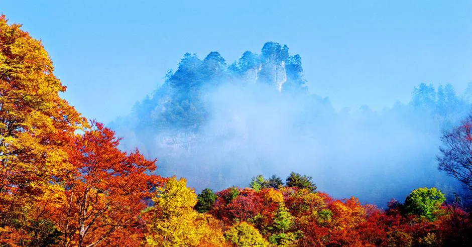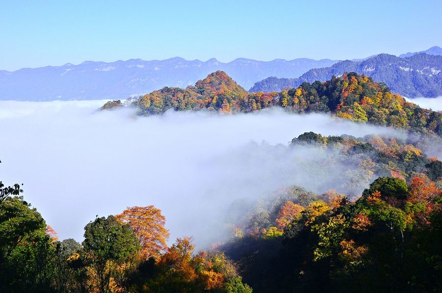 光雾山景区内的最高峰海拔2507米的光雾山,由于海拔高度的原因,光雾山的红叶颜色呈梯次变化,以蓝、绿、黄、橙、红为主。浩瀚的光雾山林海中,山山岭岭,千沟万壑,满山红叶。去光雾山不为别的,只为赶一场醉美的彩林。