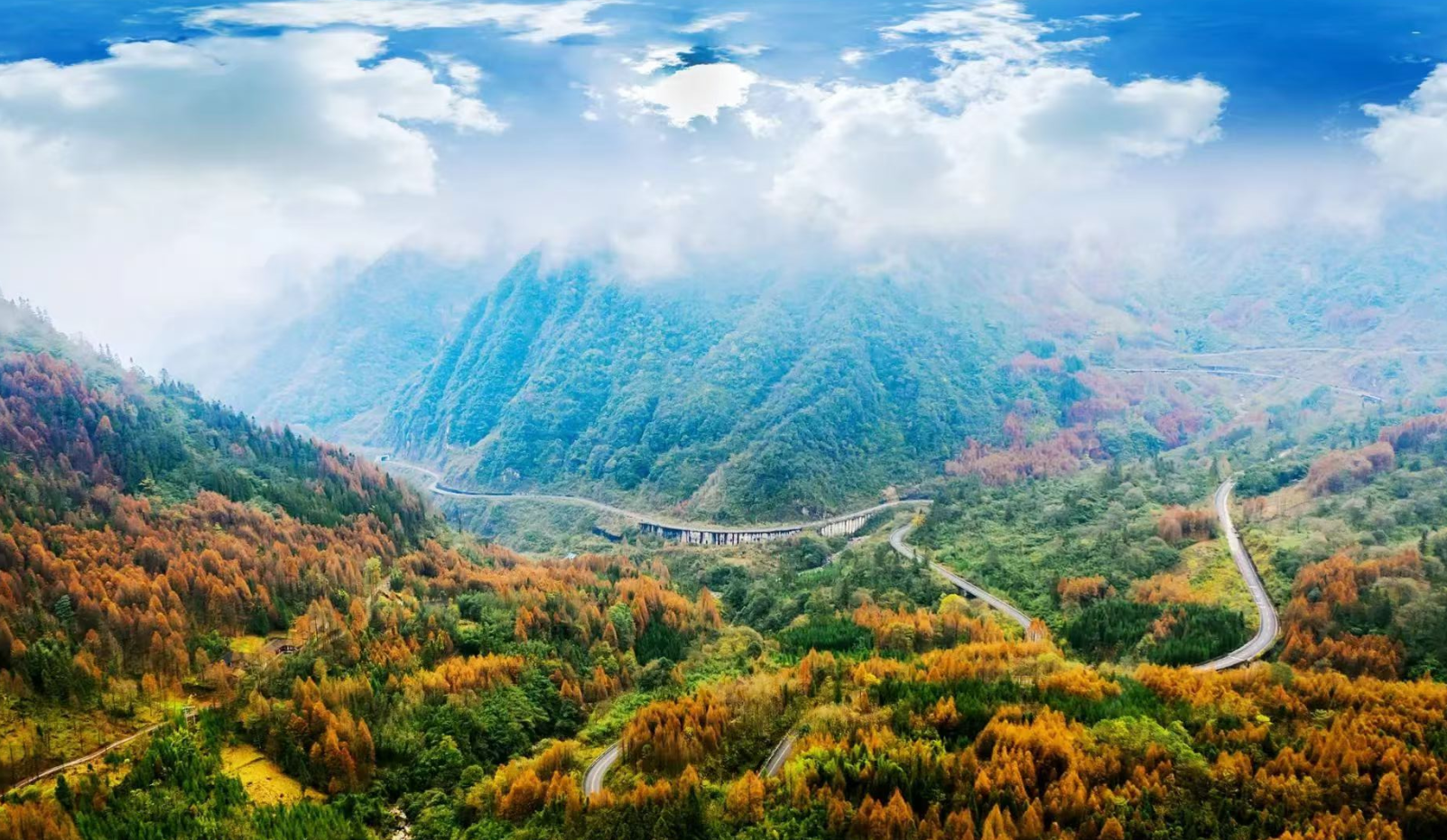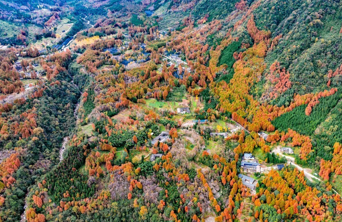 这里有被高山环抱的小村落,这里有着远离尘世喧嚣的宁静。这里海拔落差1200米至2000米,村落海拔大约1400米,山顶干五里坪海拔约2000米左右,这里常年云朵环绕,和彩林风景同框,是成都周边深秋和初冬赏景的一绝。