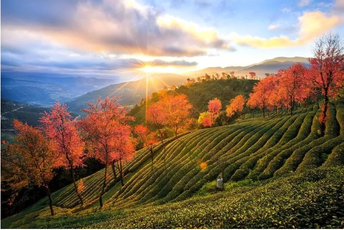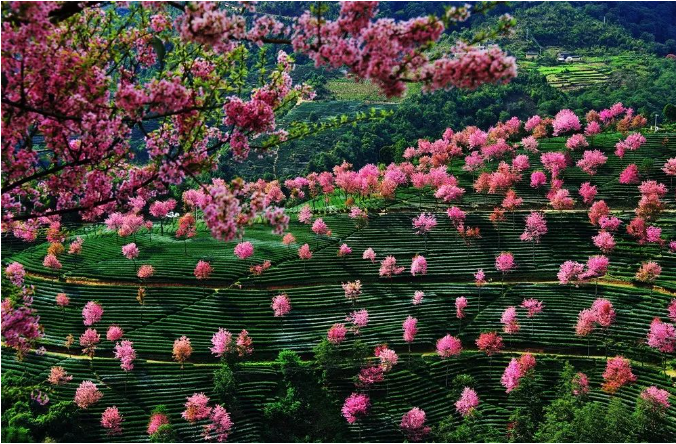 睡到自然醒后,迎着清晨的微光,驱车前往无量山樱花谷。沿途云雾缭绕,山色层叠,越靠近山谷,空气中便弥漫起淡淡茶香。若时间尚早,正值光影最柔的时刻,可拍摄晨雾缠绕的茶园与漫山粉樱。成片的樱花在阳光下轻轻晃动,粉白交织,映衬着翠绿的茶垄,如云似霞,美得不真实。放飞无人机,从高空俯瞰,山峦起伏间,粉樱与绿茶交织成一幅绝美画卷。那一刻,风温柔,光恰好,仿佛走进了春日提前到来的梦境。