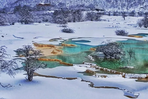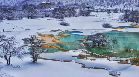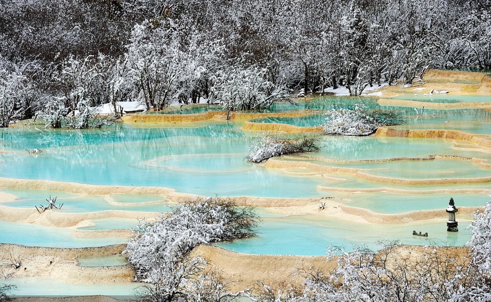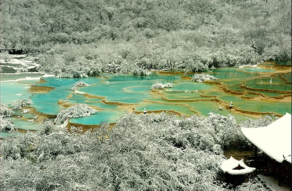黄龙以彩池、雪山、峡谷、森林"四绝"著称于世,再加上滩流、古寺、民俗称为"七绝"。