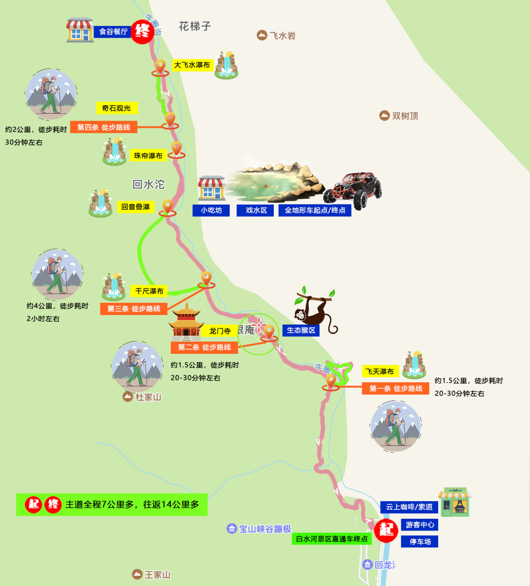 本次线路难度等级:三星难度,9公里徒步打卡领奖牌,观光车回程,硬化路段和山路为主。