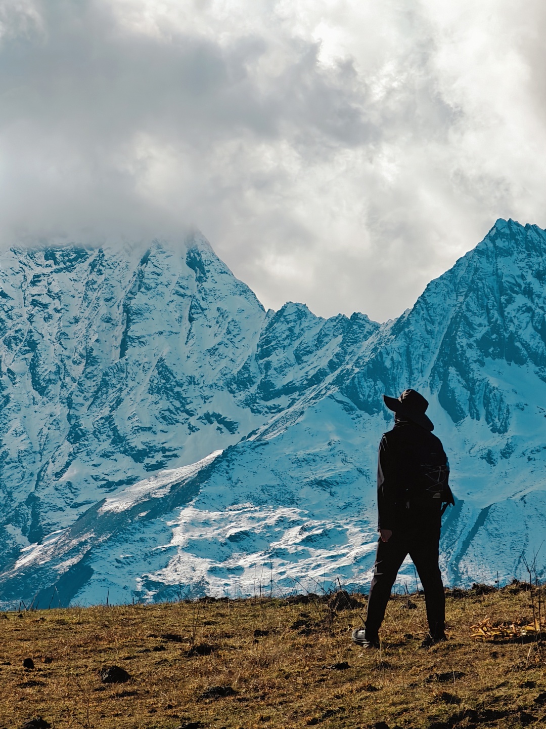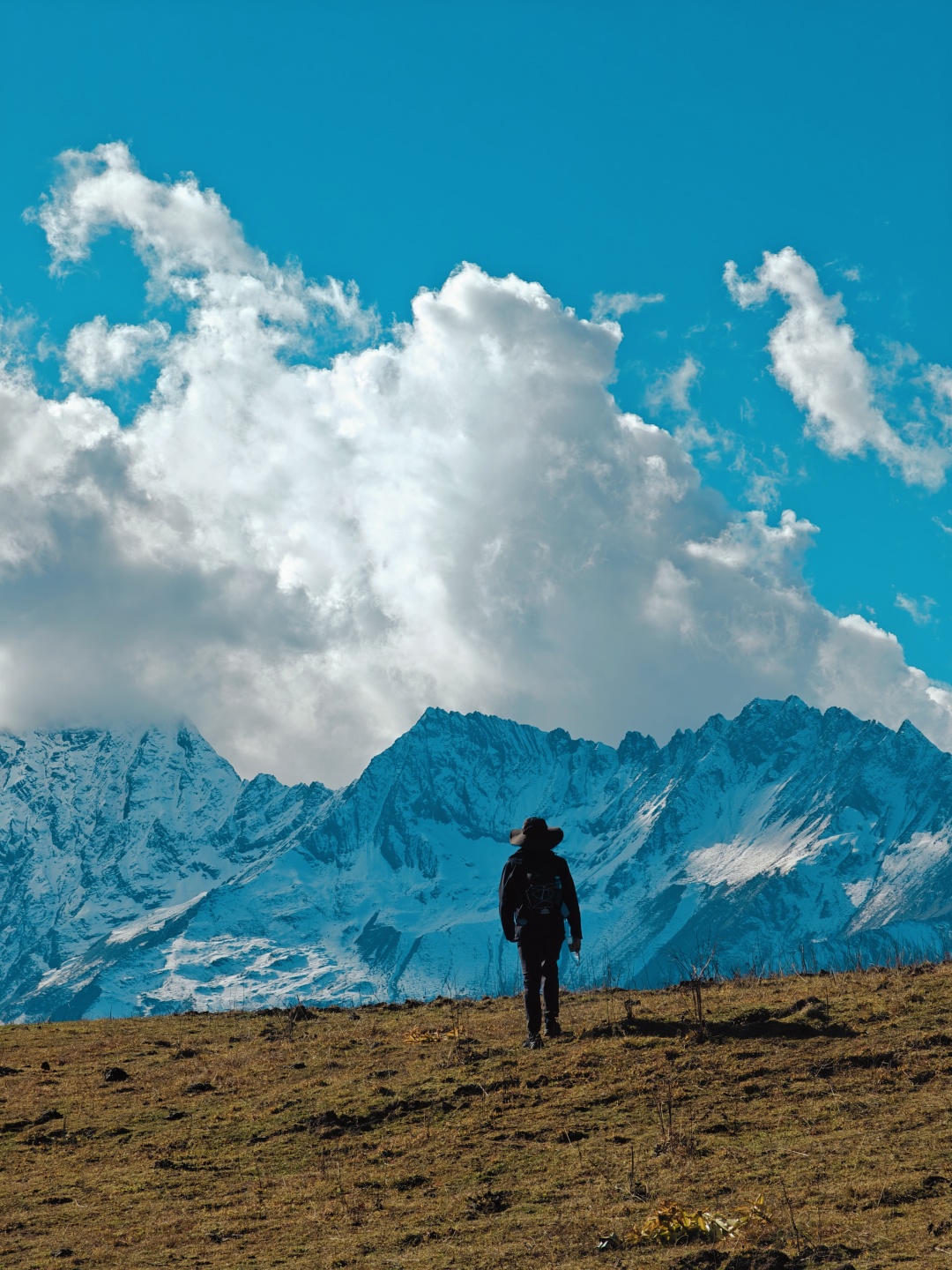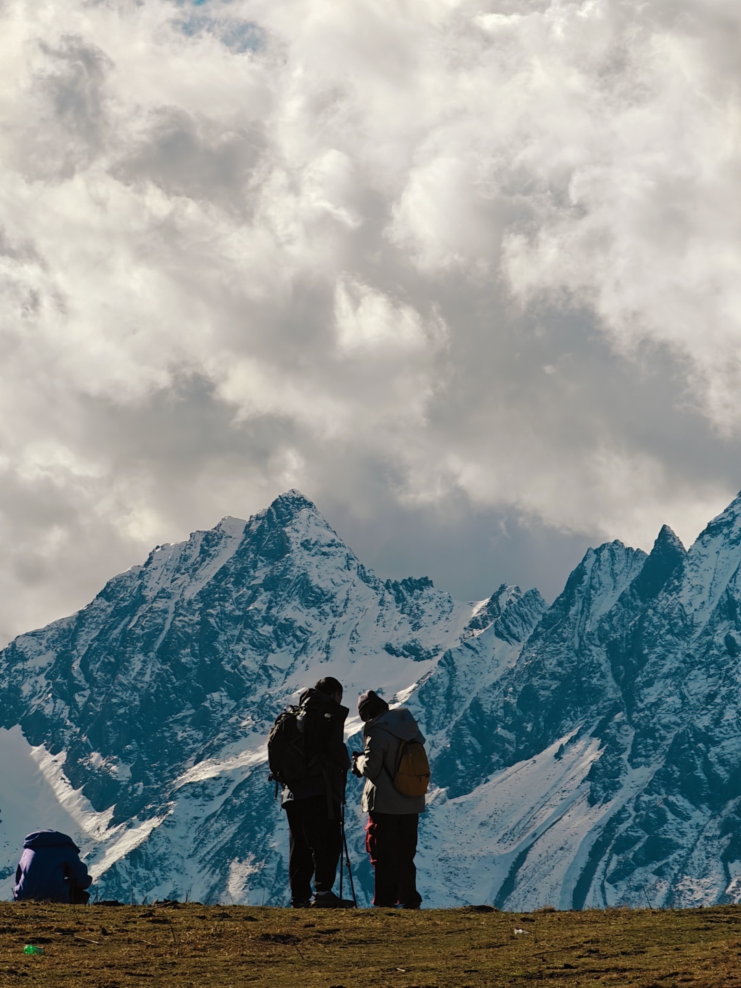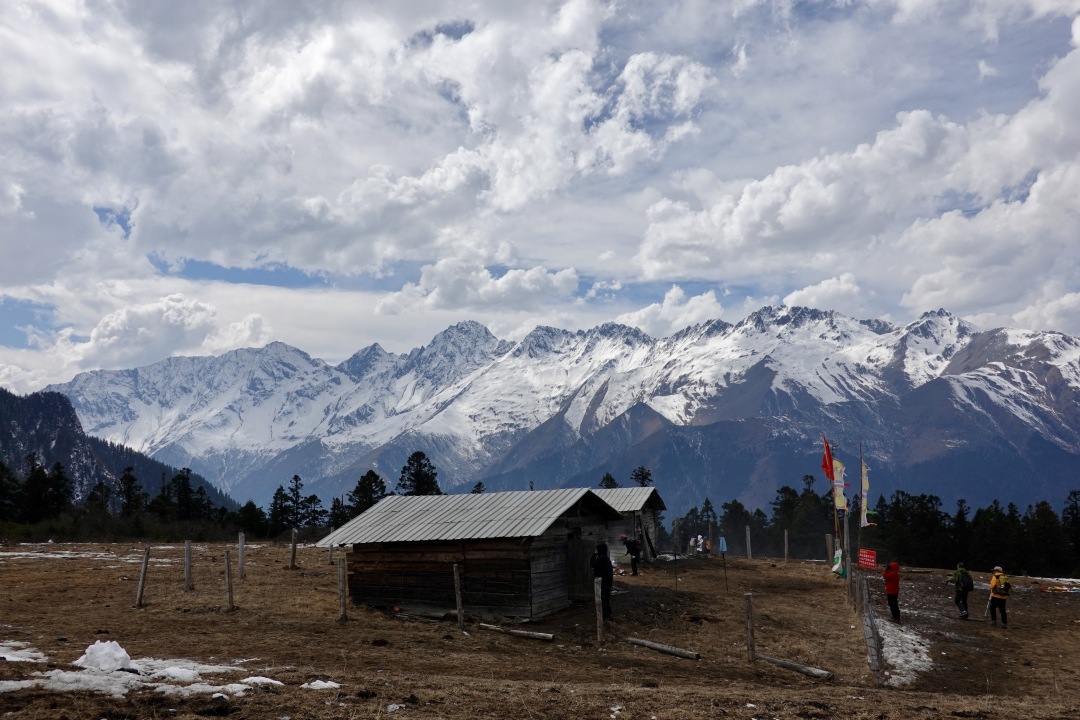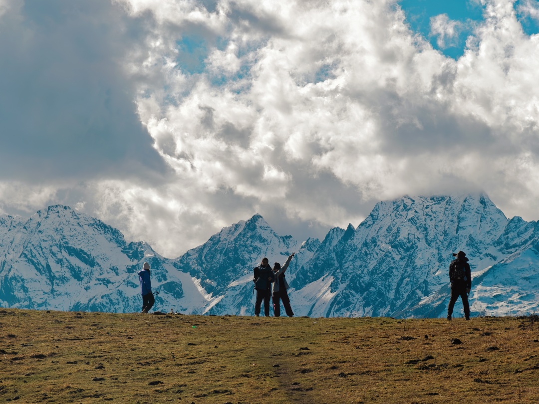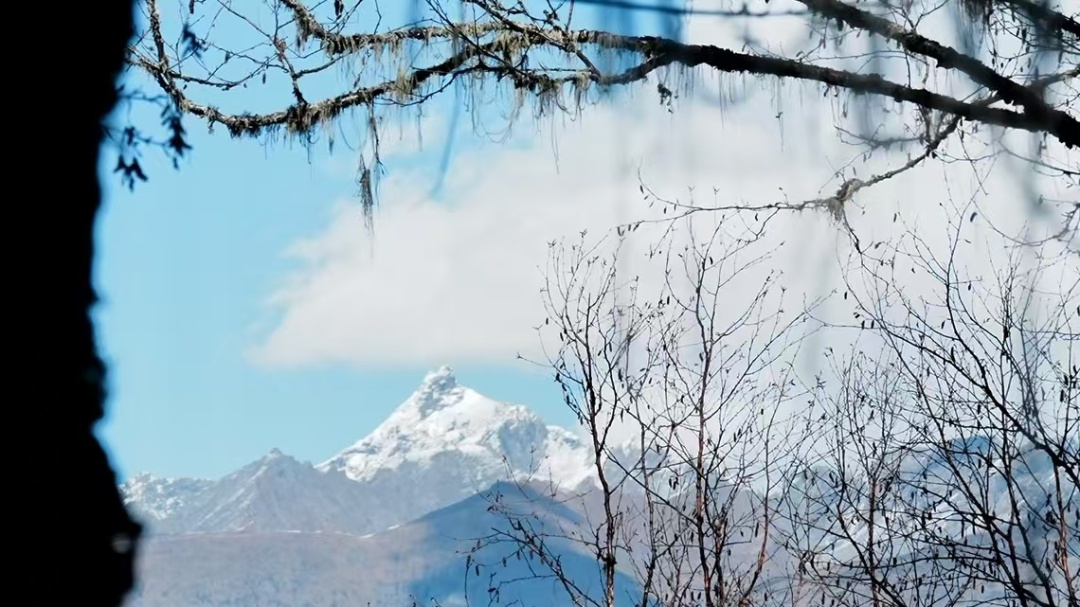 半原始森林山脊纵走,远处雪山不时隐现,感受回归山野的真趣。穿过最后一段树林,迎面一片宽阔的草场,雪山浮现视野。
