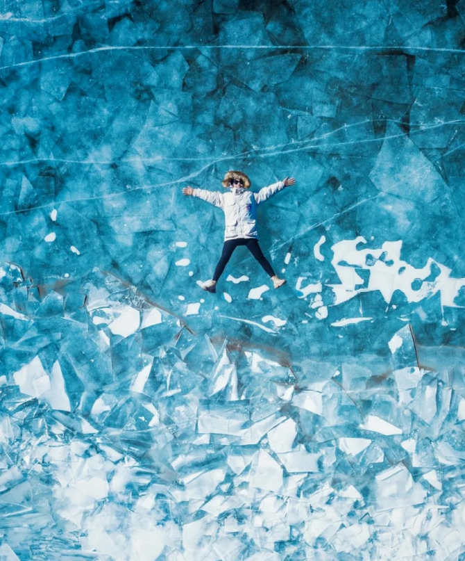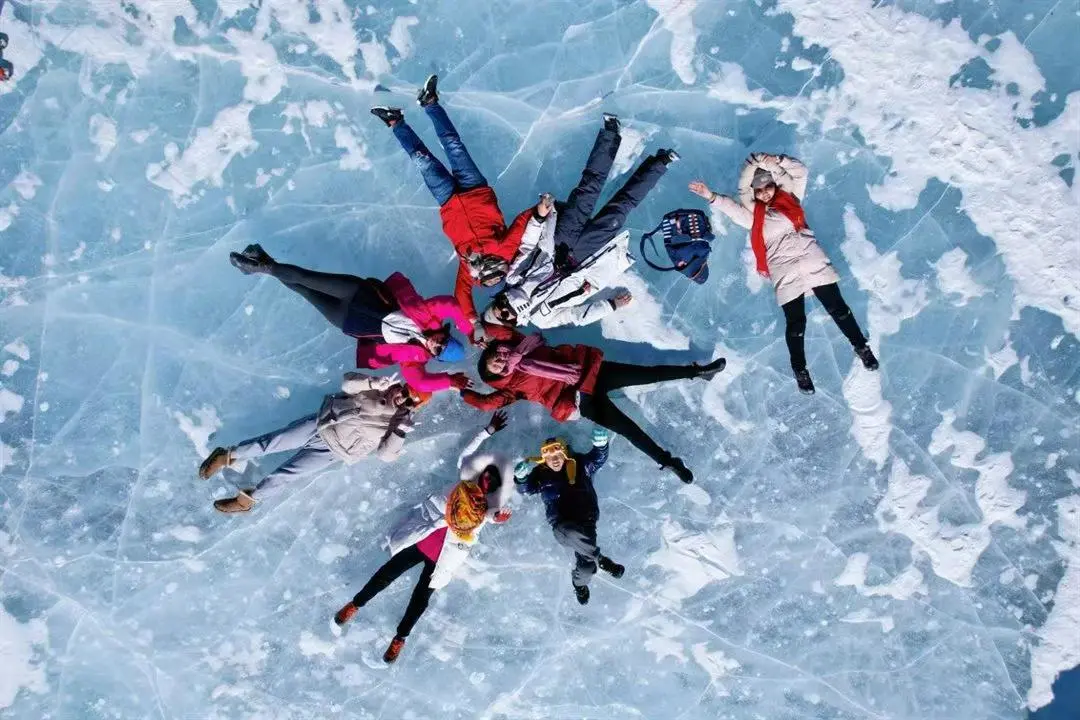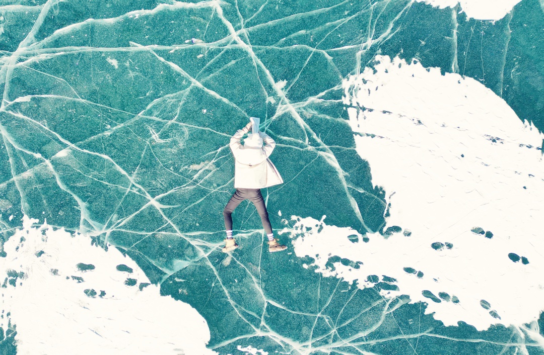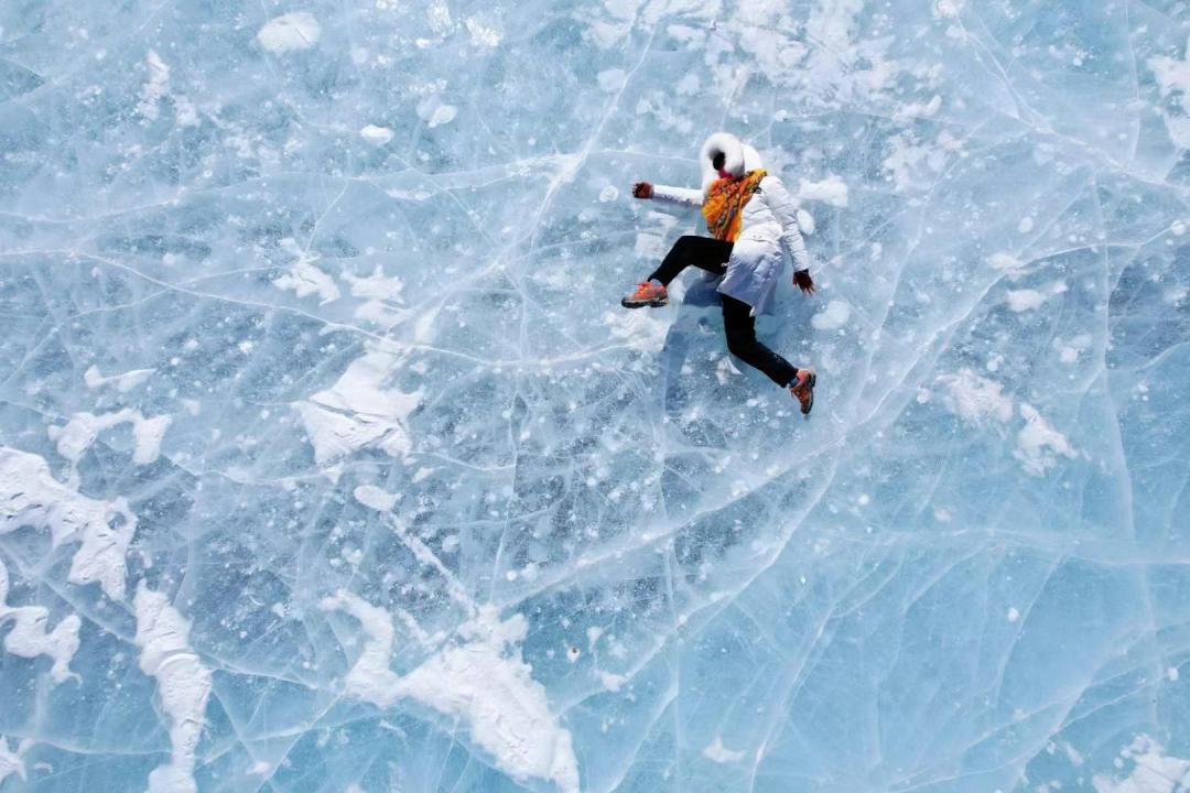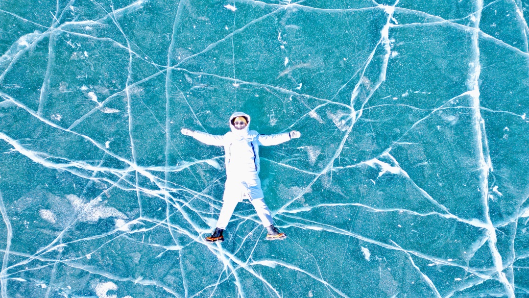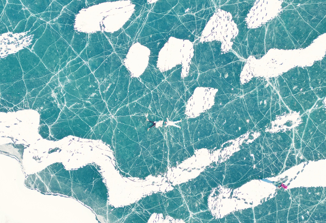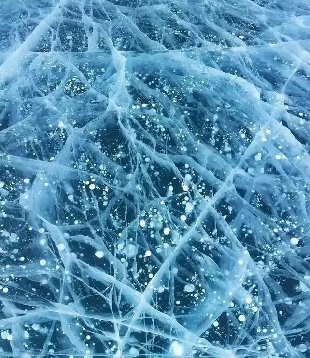 冰冻的湖面上透出一层层细小的纹理,在太阳光的照射下如俄罗斯姑娘深邃湛蓝的眼眸一样明艳动人。
