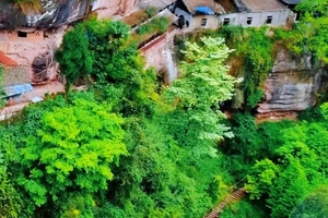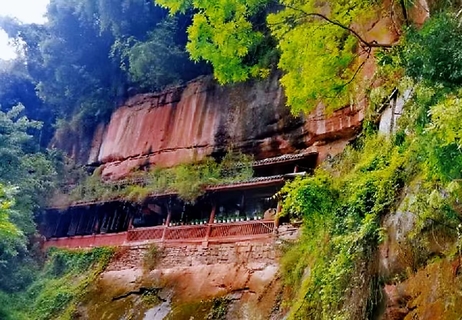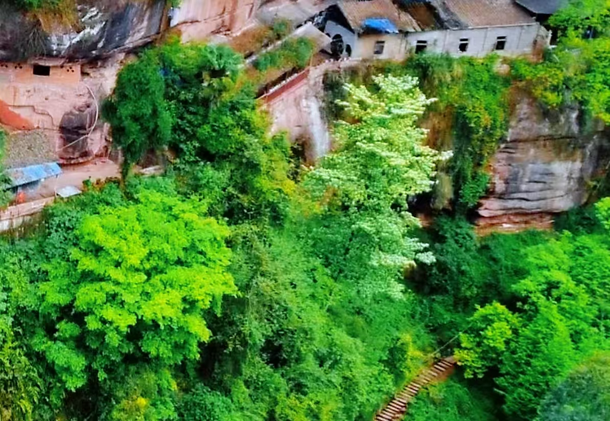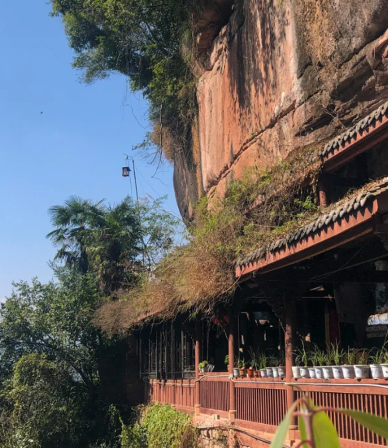 药师岩的石刻塑像群都刻在半山腰上的峭壁之上,密密麻麻的摩崖雕像让人赞叹雕刻师的手艺,更令人佩服的是工匠们在峭壁上开出了一条长一百五十多米的回廊,回廊上还建有房屋、亭台、门洞。