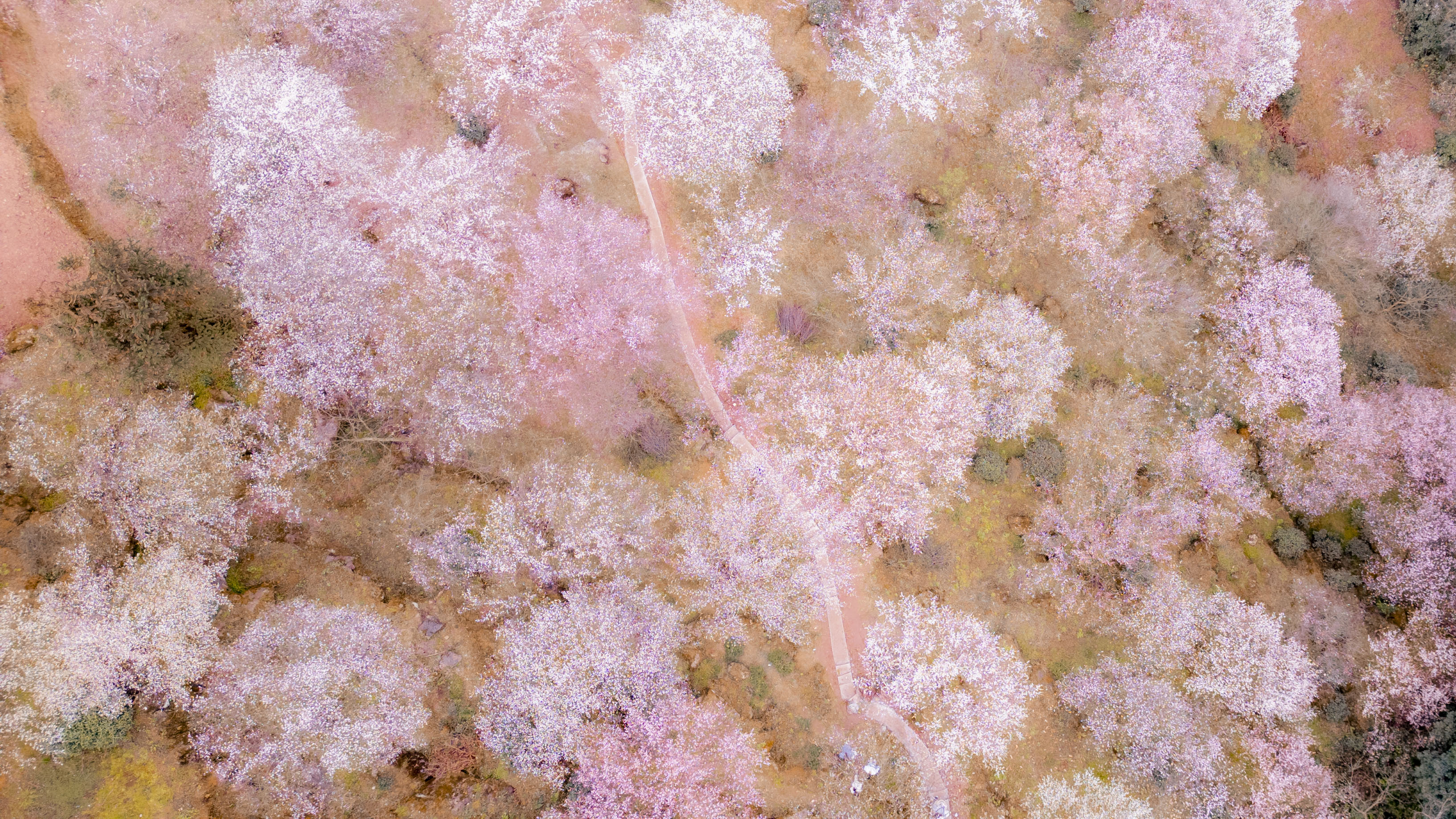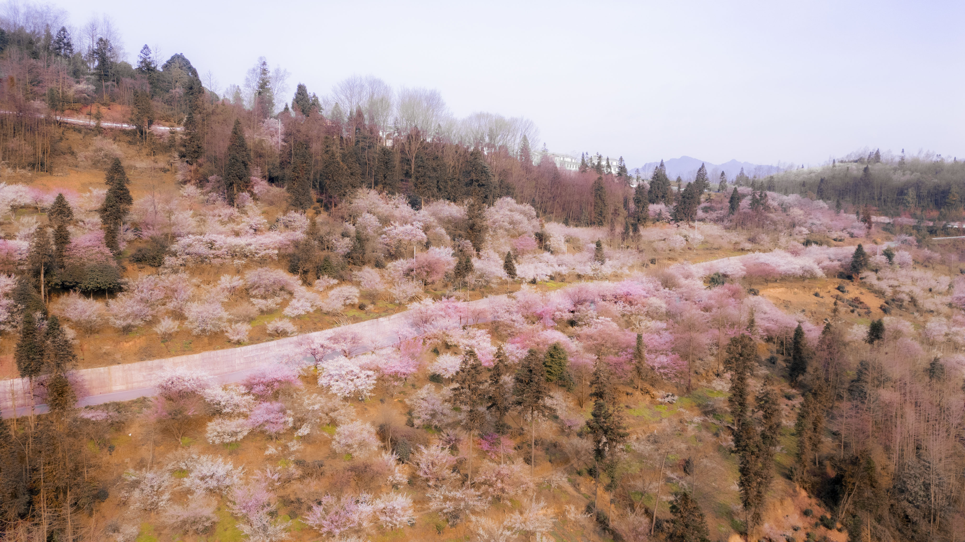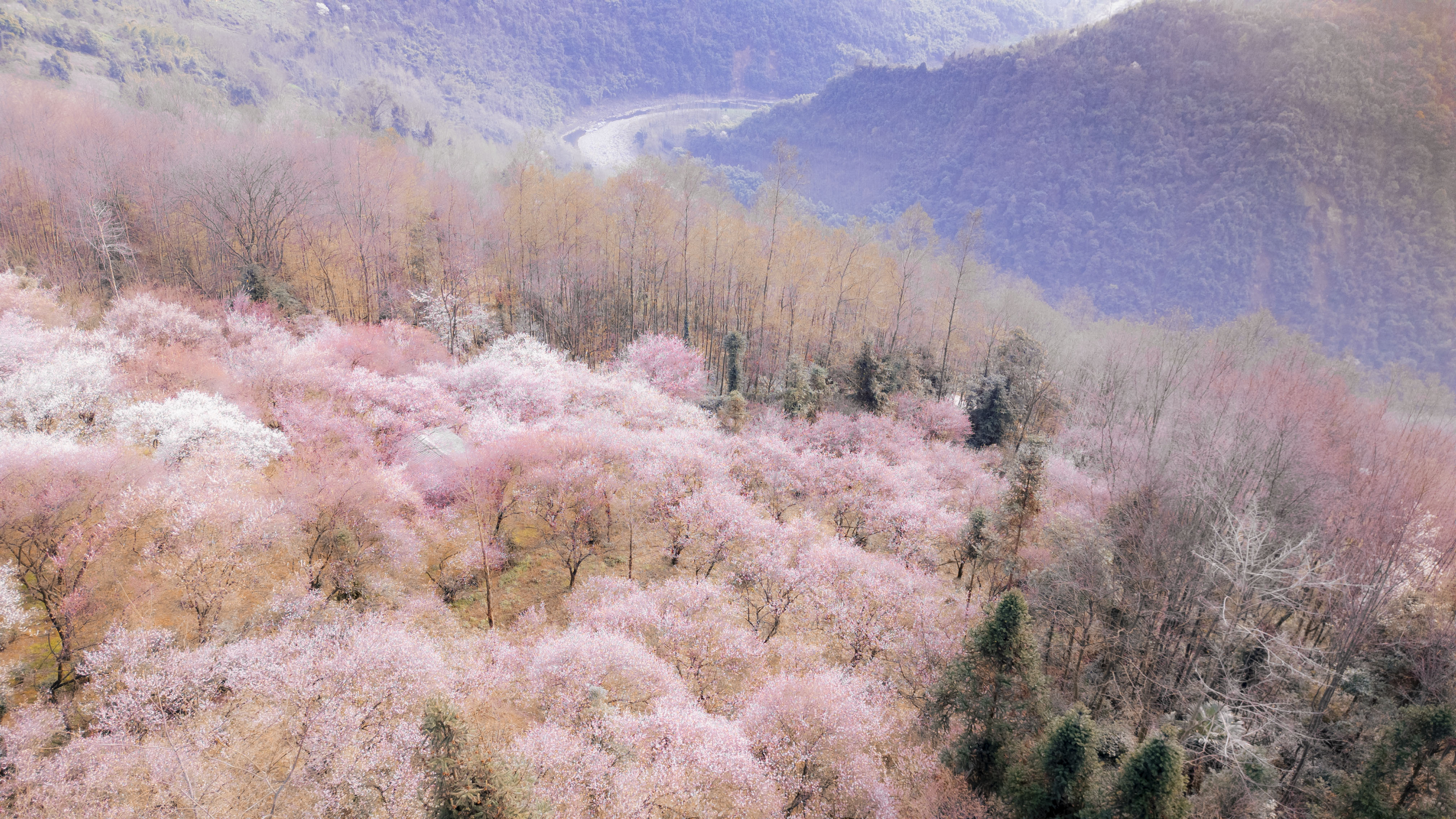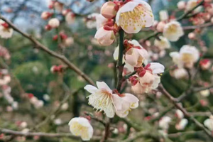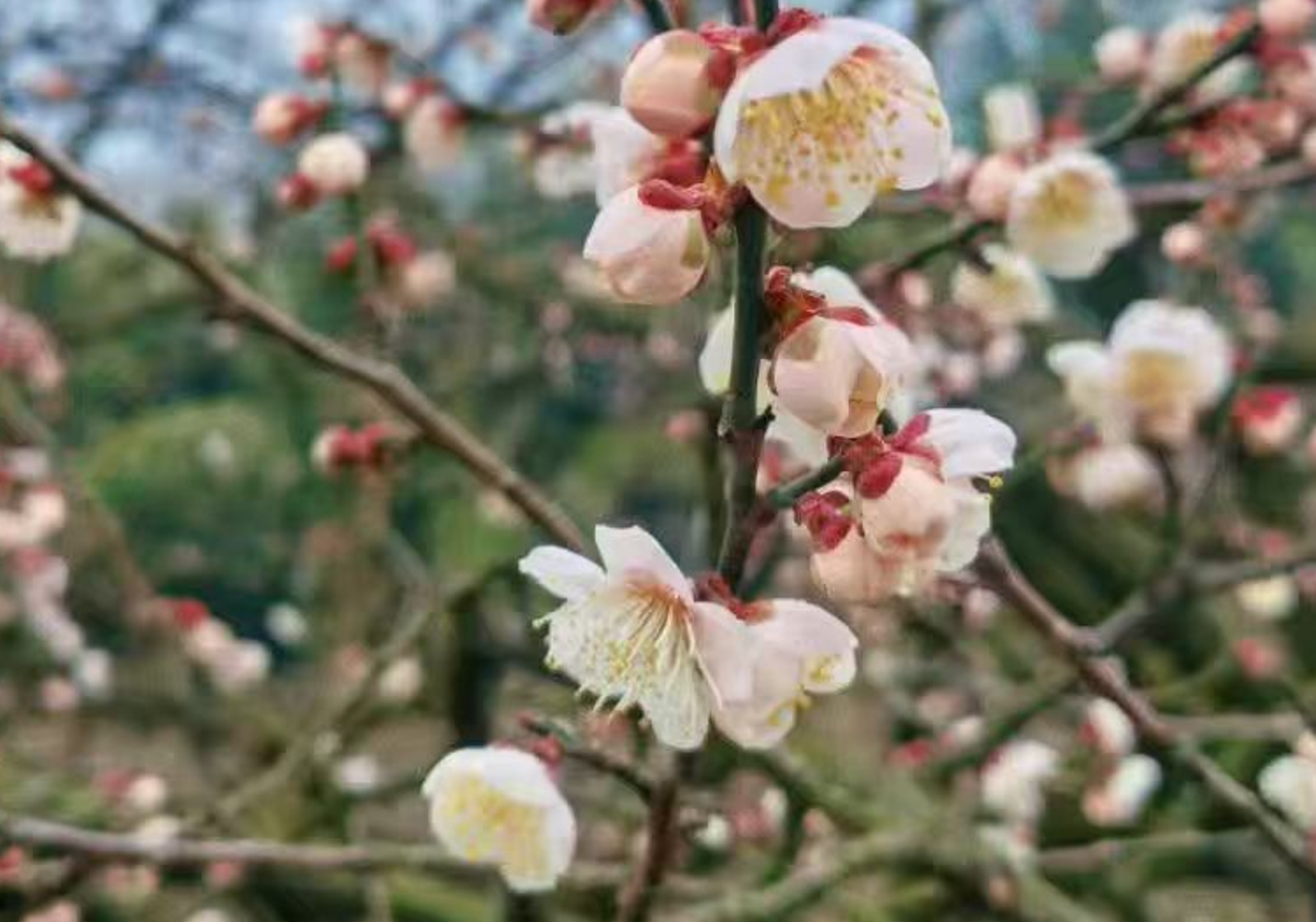 由于今年是暖冬,乌梅花比往年早开了半个月,这个周已经进入了盛花期,沿途有大片大片的梅林,白色和红色的花海铺满了整个山谷和山顶,正是赏花的最佳季节。
