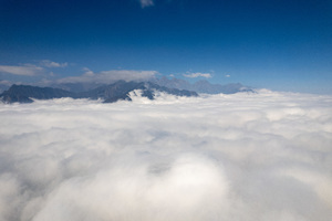 山顶上铺着厚厚的积雪,远处的云朵萦绕其间,让人感觉到透彻和纯净!