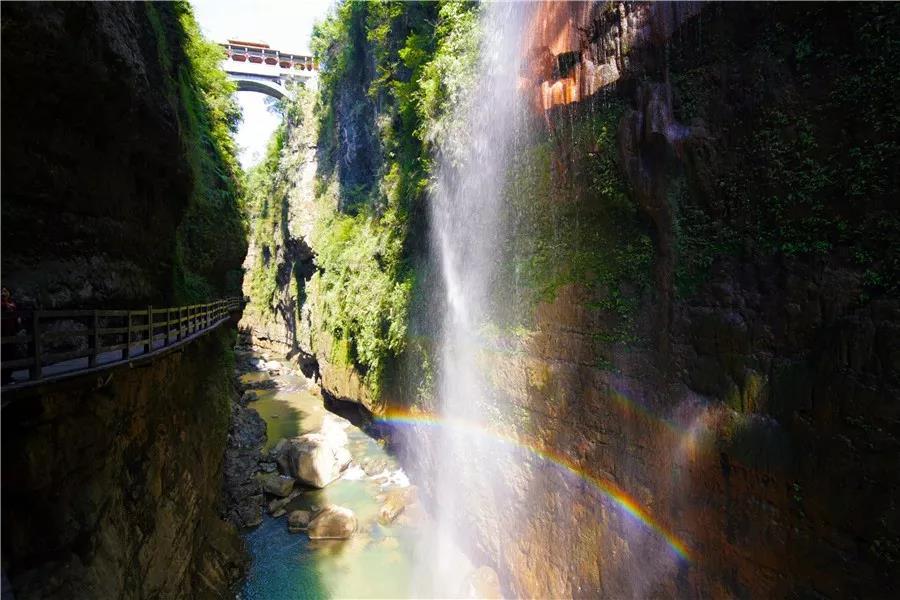 地缝上共有7条半瀑布(有一条瀑布叫“半流瀑”,丰水期有,枯水期无,故称半条瀑布)。大家看到的云龙桥上游那条瀑布,该瀑布水质清澈且在太阳下出现彩虹,游客如果有幸见到这道彩虹,必然显贵发达。