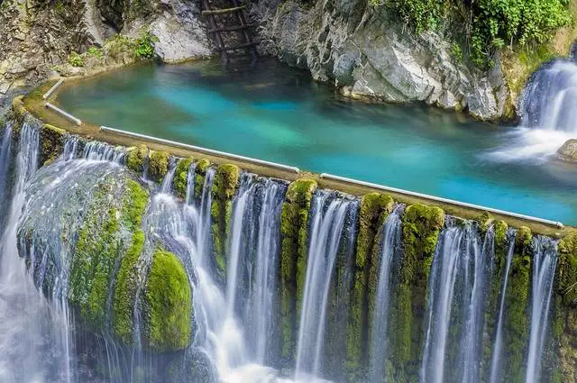 该温泉水温常年保持在40℃左右,泉水无色、无味、透明,属于氡温泉。由于瀑布是叠瀑形式,瀑布水打在身上力度刚好合适,是天然的按摩院。