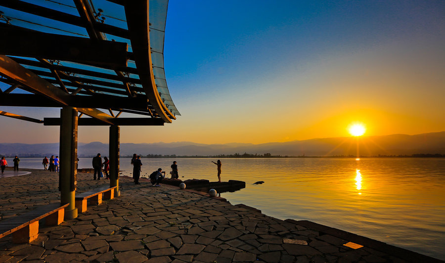 海边坐在月亮上的少女雕塑是小镇的标志性建筑,经过邛海公园可达观海湾区域,早操可俯瞰整个邛海。