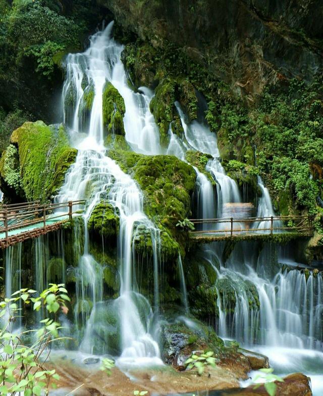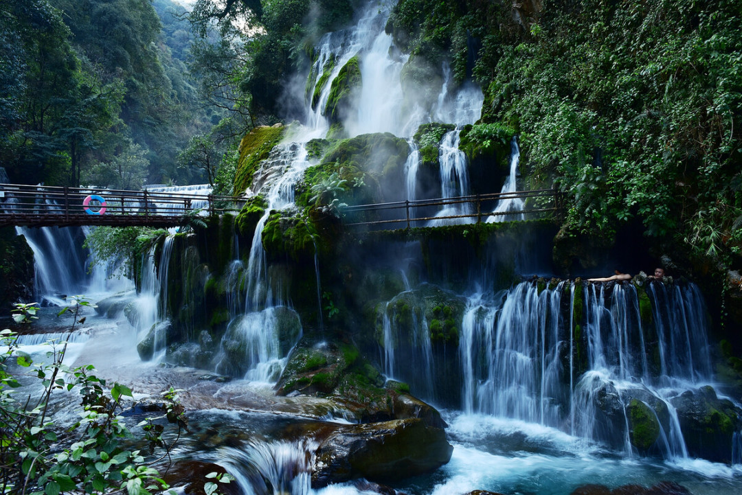 瀑布底部有几处天然洞穴,温泉水几近洞顶,人可仰头慢行通过,经历过的游客都赞不绝口。