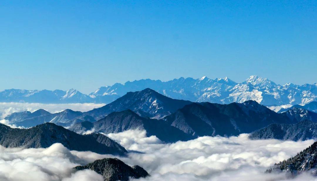 在海拔3700多米的焦山观景台,一眼望去看到的是远方群山山巅与自己视线齐平,极目远眺,群山逶迤,对面的山巅也好似一叶扁舟,在茫茫云海之中显得渺小而静谧,四下里云海翻滚。