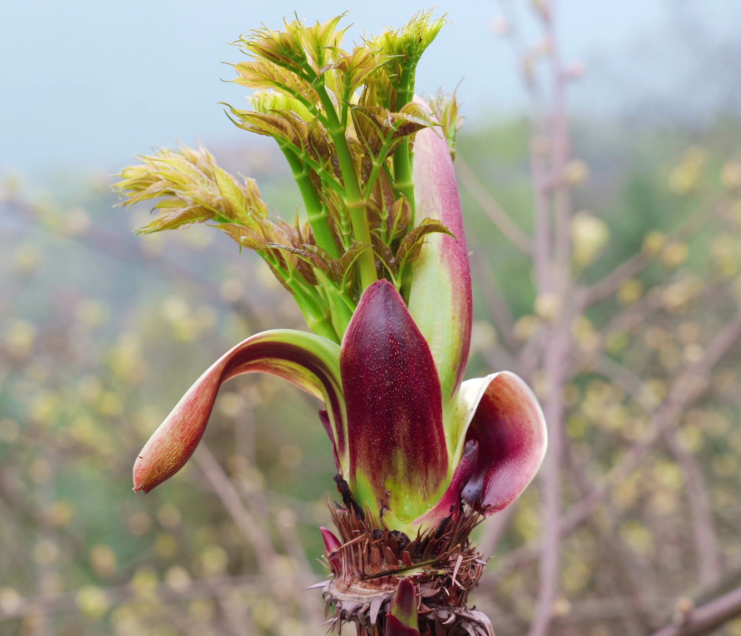 刺笼苞,也是高山独有的野菜,属五加科多年生落叶灌木或小乔木,由于树干布满坚硬针刺,所以故称为“刺笼苞”,它一般长在海拔较高的山地,具有耐寒性,分布在我国的西南山林和东北山林雪地。
