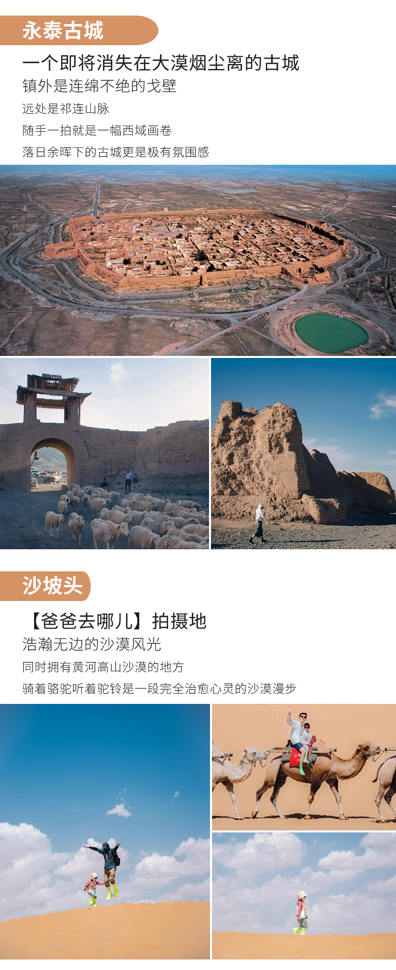早餐后我们去往永泰古城,未经现代开发改造的永泰古城仍然保留着400年前的模样,历史长河里这里一直是一座重要的军事要塞,古城四周还有4个瓮城,形似龟的肩足,城南北两侧分别指向兰州和长城方向,古城只有一个南城门,外门叫“永宁门”,内门叫“永泰门”,门稍偏西,形似龟头,四面筑有瓮城,形似龟爪。古城依旧还是那座古城,岁月却不再是那段岁月。站在古城城墙上,似乎可以听到来自戈壁深处的战马嘶鸣,还有那和400年前一样的冽冽风声。游玩后返程去往机场和火车站,结束本次活动,当晚返程的队员建议买19:00以后的飞机票和火车票。