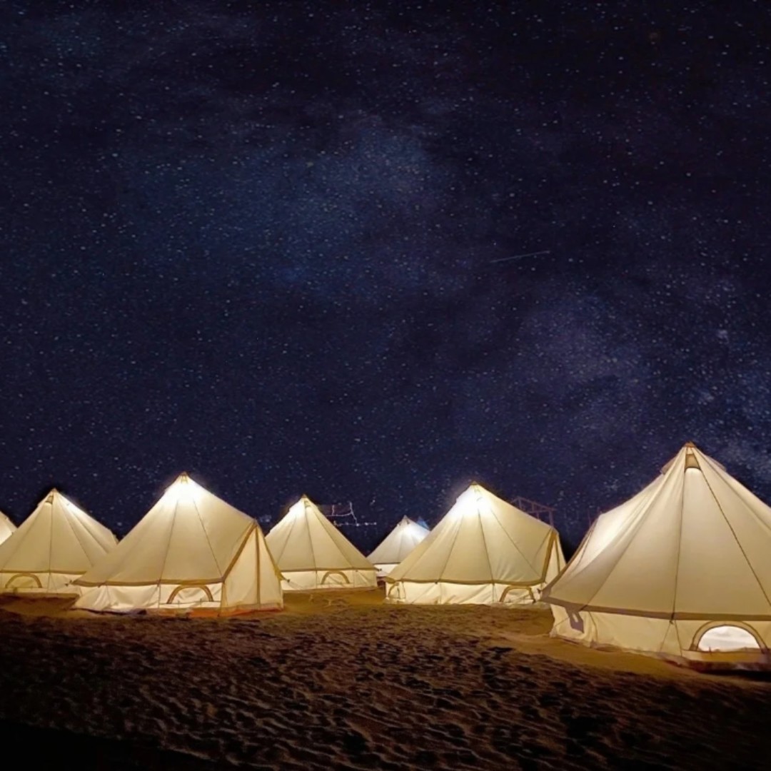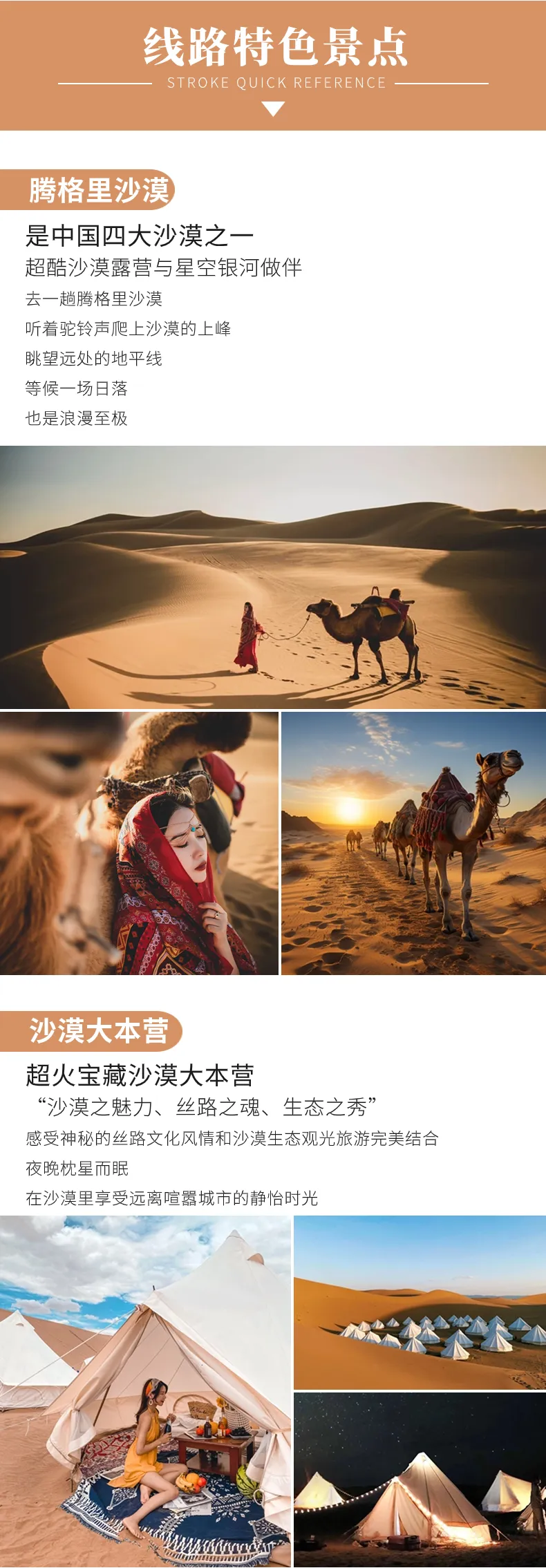 提示今天前往沙漠营地,建议携带随身小包,其他行李可以放在大巴车上(也可以带上,行李也会送到帐篷附近),入住摩洛哥帐篷(参见图片),公共卫生间可简单洗漱,洗澡洗头次日中卫酒店安排,当晚可升级其他独立卫浴房型,详询客服。