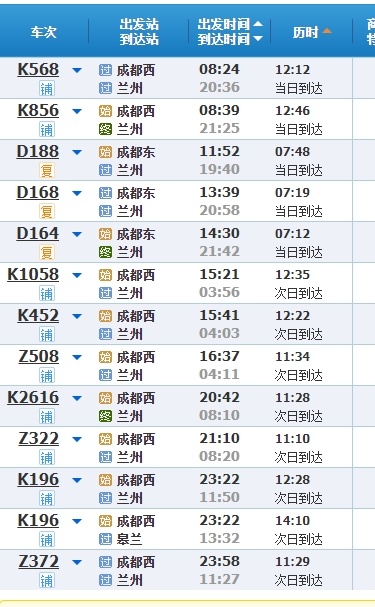 (1)动车参考车次: D768 成都出发11:50 兰州到达:19:29;