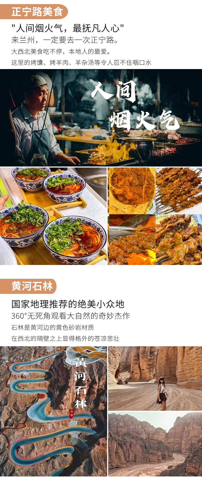 全天:今天所有小伙伴将从全国各地赶到兰州,可根据自己的意愿选择交通方式,到达后可以在酒店休息,也可以选择去看看咱们的母亲河黄河,看黄河上最古老的灌溉工具大水车,以及代表哺育中华民族的标志性雕塑黄河母亲像,走过这黄河干流上铁结构的黄河第一桥中山桥,便可以看到蕴含高亢秦腔记忆的的秦腔博物馆,当然还有古老的渡河工具羊皮筏子,也可以坐在黄河边悠闲的喝一杯三泡台;或是登高远眺,在白塔山看兰州全貌。你可以去世界十强的甘肃博物馆看看“铜奔马”(周一闭馆,需带身份证),抑或是去西关清真大寺。自由活动时间注意安全。