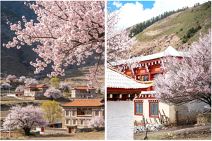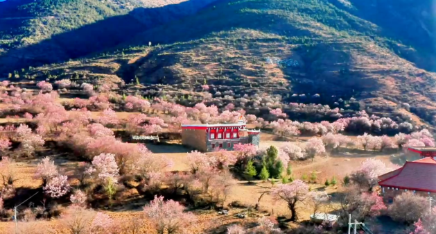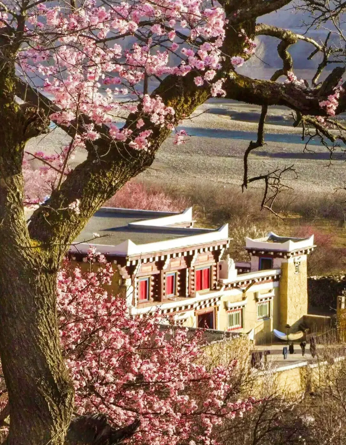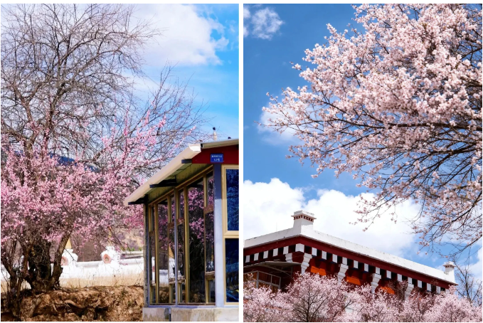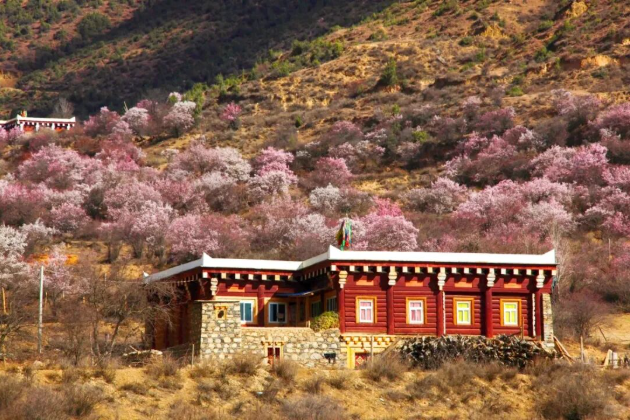 粉白杏花缠绕着白墙红壁的藏式民居