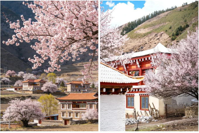 粉白花海、河谷溪流、藏乡风情相融合