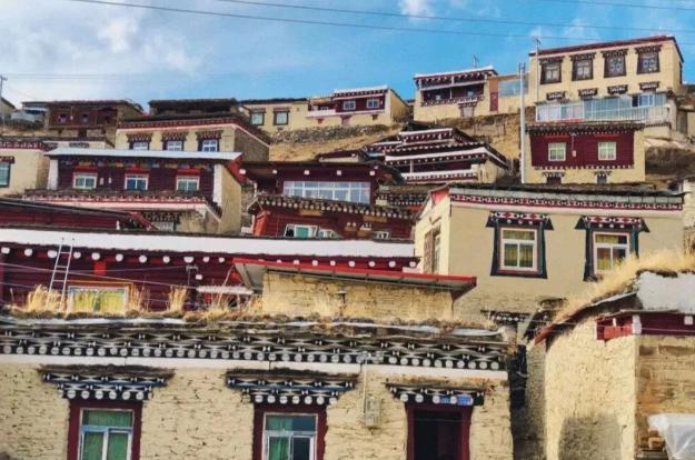 依山而建的绛红色僧房