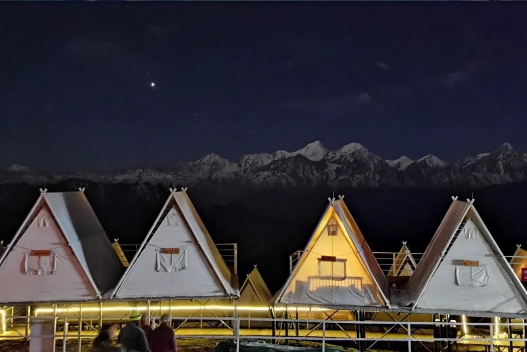 早上集合点准时出发,领队车上组织大家相互认识,一路高速直达泸定,预计11:30左右抵达泸定冷碛镇,在镇上AA午餐后前往牛背山景区长海子停车场(可能产生中转费往返100元,以实际为准)。换乘景区观光车上山(行车时间约1.5h左右),抵达牛背山乾坤岭。随后跟随领队的步伐经乾坤岭栈道前往山顶(单边1.3公里,行李随转运车用送到酒店领取),安排住宿后,跟随领队拍摄雪山大片。晚餐可以去在牛背山的贡嘎雪山观景餐厅享用热气腾腾的牦牛肉汤锅(自理,可代订)。晚上入住牛背山三角帐篷20平米标间,带【24小时暖气】【带电热毯】,有露台,不带卫生间,卫生间为公用,有【热水供洗漱】,也很干净)。晚上银河升起,大家自行观星,躺在星空下,浪漫至极。(可升级住宿,报名可直接备注升级房型或联系客服)
